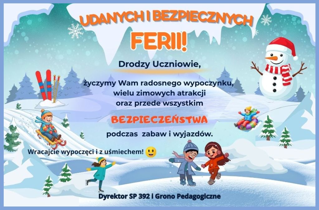 Drodzy Uczniowie, życzymy Wam radosnego wypoczynku, wielu zimowych atrakcji oraz przede wszystkim bezpieczeństwa podczas zabaw i wyjazdów. Wracajcie wypoczęci i z uśmiechem! Dyrektor Szkoły Podstawowej nr 392 Marzena Rutkowska i Grono Pedagogiczne