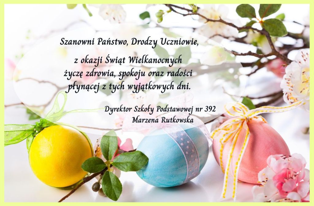 Z okazji świąt Wielkanocnych składam Uczniom, Rodzicom, Współpracownikom oraz Sympatykom szkoły najserdeczniejsze życzenia: zdrowia, szczęścia oraz wszelkiej pomyślności. Życzę, aby świąteczny czas był okresem pełnym miłości, ciepła i spokoju i radości płynącej ze spotkań z najbliższymi. Dyrektor Szkoły Podstawowej nr 392 Marzena Rutkowska