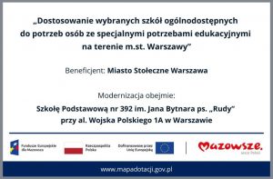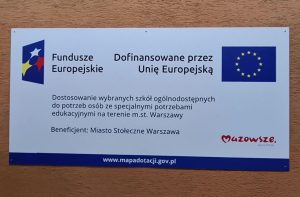 Nasza szkoła bierze udział w projekcie: „Dostosowanie wybranych szkół ogólnodostępnych do potrzeb osób ze specjalnymi potrzebami edukacyjnymi na terenie m.st. Warszawy”.