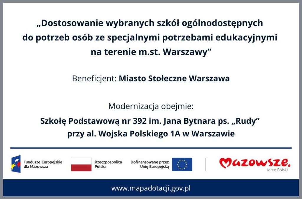 Modernizacja obejmie: Szkołę Podstawową nr 392 im. Jana Bytnara ps. „Rudy” przy al. Wojska Polskiego 1A w Warszawie.