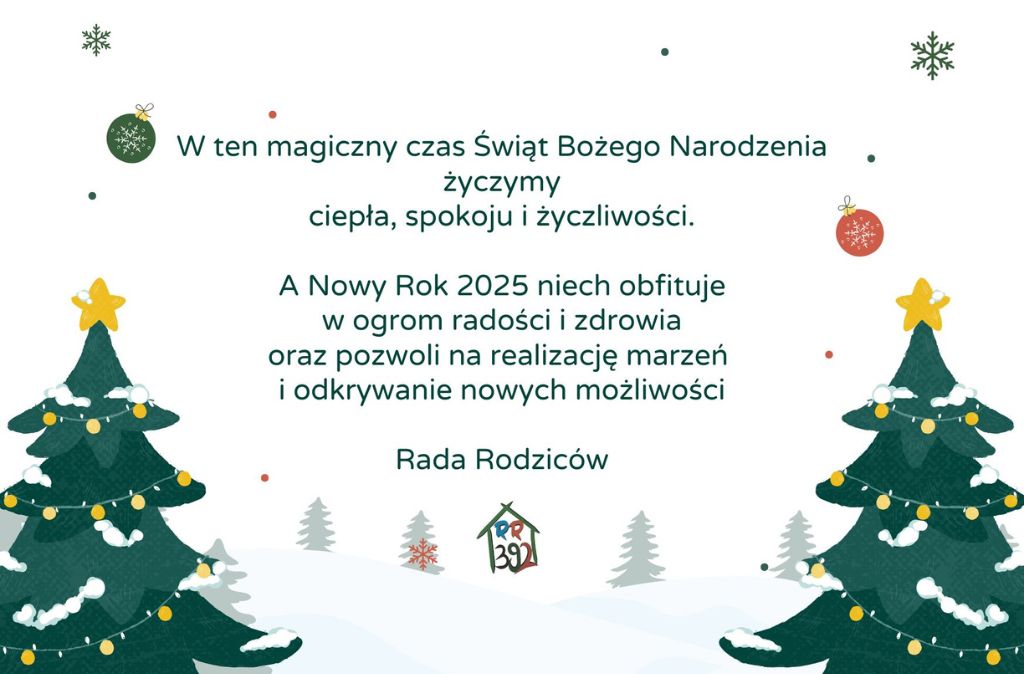W ten magiczny czas świąt Bożego Narodzenia życzymy ciepła, spokoju i życzliwości, a Nowy Rok 2025 niech obfituje w ogrom radości i zdrowia oraz pozwoli na realizację marzeń i odkrywanie nowych możliwości. Rada Rodziców