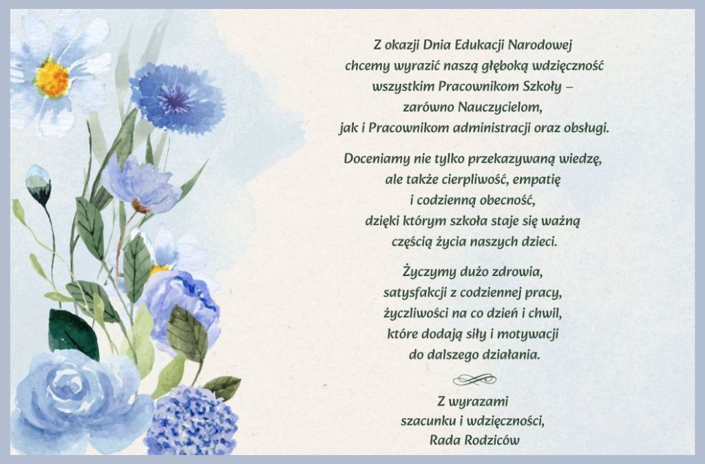 Z okazji Dnia Edukacji Narodowej chcemy wyrazić naszą głęboką wdzięczność wszystkim Pracownikom Szkoły – zarówno Nauczycielom, jak i Pracownikom administracji oraz obsługi. Doceniamy nie tylko przekazywaną wiedzę, ale także cierpliwość, empatię i codzienną obecność, dzięki którym szkoła staje się ważną częścią życia naszych dzieci. Życzymy dużo zdrowia, satysfakcji z codziennej pracy, życzliwości na co dzień ...